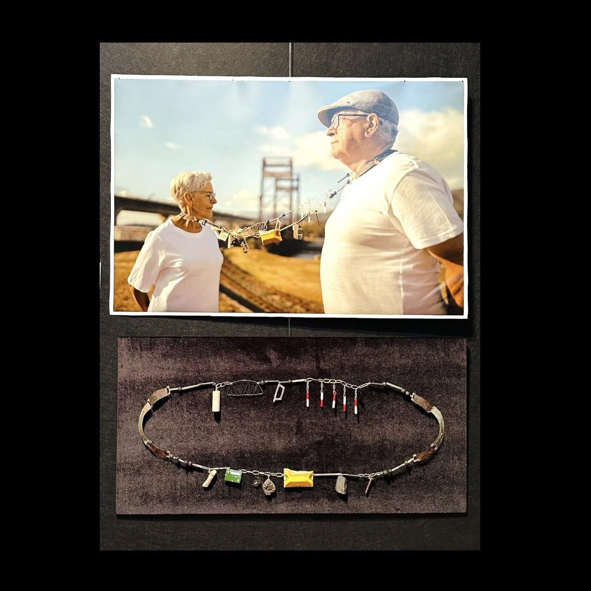 This necklace is designed to be shared - worn between two people. It is a metaphor for the connections bridges create. Made from brass, copper, steel, aluminium, iron, zinc, basalt, bone, cast concrete, found objects, and enamel, it reflects both the old and new bridges, blending natural and man-made, raw and refined.