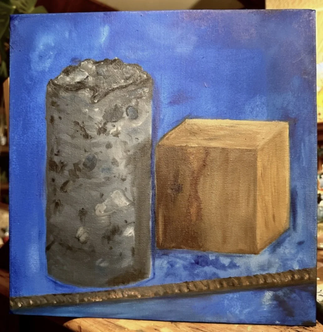 I created this still life to honor the old Bridgewater Bridge and the materials that made it strong—concrete, timber, and steel. These objects sit together like ingredients in a recipe. The blue background represents the Derwent River, which has carried the bridge’s reflection for many decades. My painting is a tribute to the raw materials and engineering that have provided safe passage for people for 80 years.